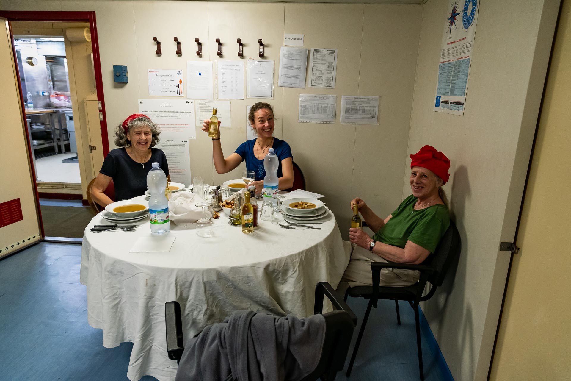 Die Schiffs-Crew besteht aus 27 Personen und ist eine Mischung aus italienischen Offizieren und philippinischer Besatzung. Der Kapitän ist ein Italiener wie er im Buche steht und er hat das Sagen an Bord. Die Passagiere essen im Raum zusammen mit den Offizieren, der Kapitän kommt wenn wir fertig gegessen haben. Dann wird aber auch dafür gesorgt, dass wir den Raum verlassen. Die Hierarchie ist nicht zu übersehen. Mittags und abends gibt es ein Dreigänge-Menü mit Tischwein und weisser Tischdecke – man fühlt sich schon fast wie auf einem Kreuzfahrtschiff. Aber natürlich nur fast, denn der Rest des Tages ist tote Hose und jeder geht seiner Arbeit nach und wir müssen auf das abendliche Unterhaltungsprogramm verzichten – zum Glück!