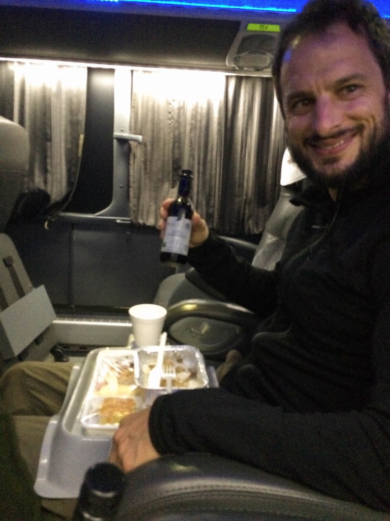 Gelesen hatten wir schon einiges positives über die guten Busse in Argentinien. Aber als wir dann unsere recht grosszügigen Sitze einnehmen, noch ein bisschen lesen und langsam einschlafen, sind wir hellauf begeistert, als uns um 23 Uhr der Steward sanft weckt und uns unser warmes Essen serviert. „Chicos, quieron vino“? – aber klar, nehmen wir Wein, wir sind ja schliesslich in Argentinien und schon bekommen einen leckeren Malbec serviert.