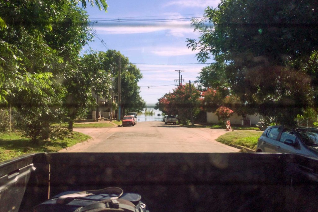 Livio ist begeistert, dass wir Colón besuchen, den besten Ort in Argentinien. Colón liegt direkt am Fluss Rio Uruguay und ist in den Sommermonaten ein sehr beliebter Urlaubsort für die Südamerikaner. Doch schon im Auto erzählt er uns die aktuellen News. Der Fluss ist auf Grund des vielen Regens in Brasilien um stolze 9 Meter angestiegen und die ganze Uferpromenade des Städtchens ist überschwemmt. Er gibt uns direkt eine kleine Stadtrundfahrt und wir sehen wie die Strassen einfach im Wasser enden. Auf Grund der enormen Regenwaldabholzung in Brasilien, werden die Flüsse immer voller, da der Boden das Wasser nicht mehr speichern kann. Der Staudamm ca. 40 km nördlich von Colón kann die Mengen an Wasser nicht mehr tragen und muss kontinuierlich geöffnet werden und alles weiter südlich wird überschwemmt.