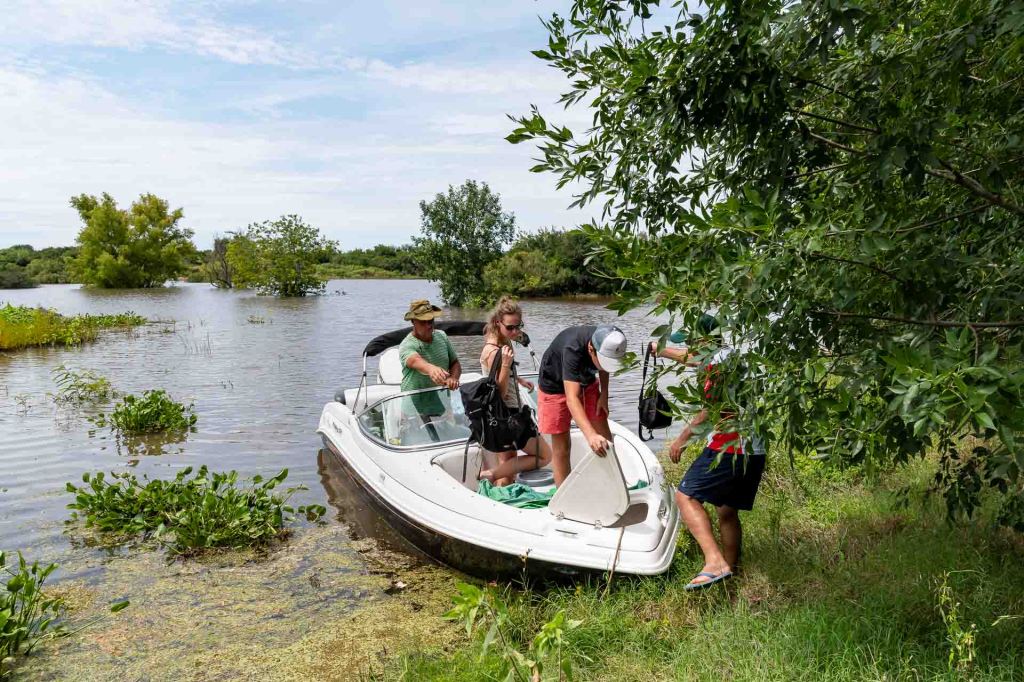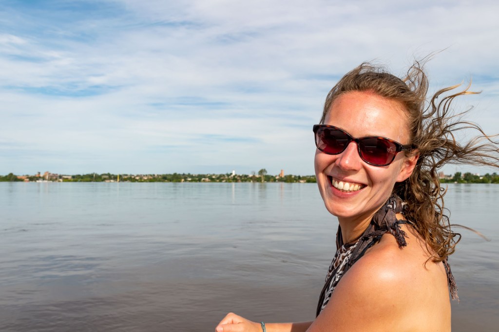 Somit hat sich dann unsere Idee am Fluss zu Campen schnell erledigt. Zudem hat auch kein Couchsurfer auf unsere Anfrage geantwortet und so überlegen wir, ob wir nicht direkt weiter nach Uruguay fahren sollen. Als wir Livio bitten uns am Busbahnhof auszuwerfen, wir unsere Rucksäcke schnappen und uns gerade dabei sind uns zu verabschieden, zeigt er auf einen Kanister mit Diesel. Das sei für sein Boot und sie machen nachher noch einen Ausflug auf den Fluss, haben genug Platz und wir können gerne mitkommen. Roman und ich tauschen einen kurzen Blick aus, etwas verdutzt von dem spontanen Angebot und werfen unsere Rucksäcke zurück auf die Ladefläche – klar kommen wir mit. In der Zwischenzeit macht Livio einen Anruf bei seiner Frau Paola um zu fragen, ob noch in einer der Unterkünfte, die sie betreiben, Platz sei. Wir dürfen eine Nacht bleiben, als Geschenk an uns. Wir sind gerührt und steigen ein.