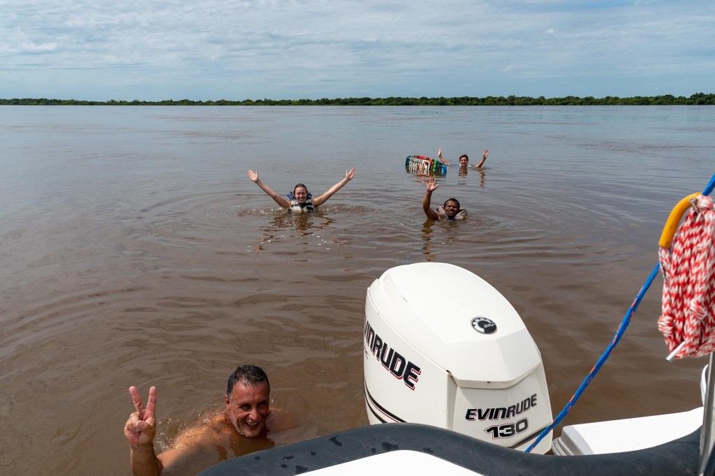 So verrückt wie es manchmal ist, sitzen wir eine halbe Stunde später in der hübschen und familiären Hotelanlage der Familie, Paola macht uns Kaffee und wir erzählen unsere Geschichte. Am Nachmittag brechen wir auf und erkunden gemeinsam mit Livios Sohn Pedro und Jesus den Fluss. Es ist ziemlich beängstigend zu sehen, wie hoch das Wasser steht. Komplette Strassen stehen unter Wasser, von den Strassenschildern sind nur noch die oberen 20 cm zu sehen und die schönen Strände der Region und die Uferpromenade lernen wir nur von Google-Bildern kennen.