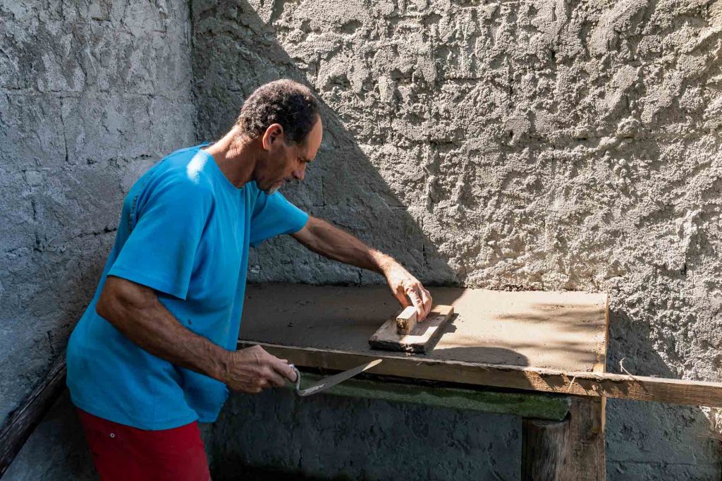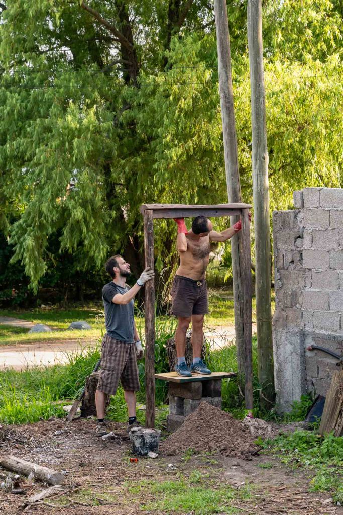Ich beginne mit dem Anlegen eines Gemüsebeetes, wie Hugo sagt “Das ist eine gute Arbeit für eine Frau“. Roman hilft ihm beim Zaun und überlegt sich die Konstruktion für das Vordach. Schon nach einer Stunde Erde herumtragen merke ich meinen faulen Schreibtischrücken, der Schweiss tropft bereits morgens um 8 Uhr dank der Hitze die Stirn runter. Aber es bringt Spass zu sehen, was man in 4 Stunden alles schafft. Roman und Hugo sind trotz der Sprachbarrieren ein sehr gutes Team und Hugo schätzt Romans Ingenieurwissen, sein Mitdenken und seine Geduld sehr. Denn Hugo ist genau wie ich Zwilling (verrückt aber wahr: wir haben am gleichen Tag Geburtstag) und so wie ich zack zack und mit manchmal bescheidener Geduld unterwegs. Daher ist Hugo begeistert von dem Mix aus Schweizer Wissen und Präzision und uruguayanischem Umsetzen.