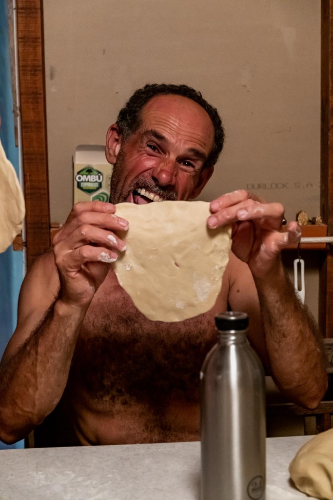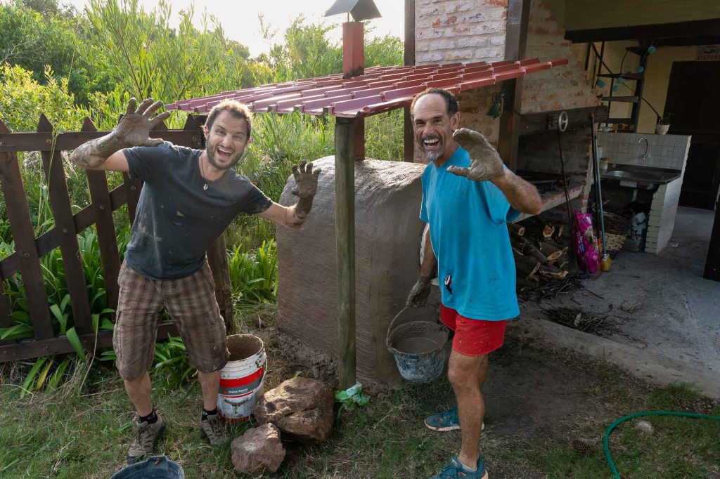 Hugo ist ein kerniger 52-jähriger Uruguayaner und Aussteiger wie er im Buche steht. Er möchte ein Leben zurück zu den Wurzeln und baut gerade ein ökologisches Haus mit einem Permakulturgarten. Alles aus recycelten Materialen, denn viel Geld hat er nicht. Aber er hat keine Lust mehr auf den Stress, auf das verrückte Leben in dem sich alles nur um Konsum dreht. Wir verstehen ihn sehr gut. Er möchte lieber wieder mehr Zeit für sich haben um Dinge zu machen, die ihm Spass bringen. Er ist ein kreatives Köpfchen, extrem praktisch, stark, agil und fingerfertig. Er bastelt leidenschaftlich gerne und weiss in jeder Situation eine Lösung. Er versteht es Dinge zu recyceln und weiss unglaublich viel über das Bauen mit natürlichen Ressourcen. Da er aber alleine lebt und somit alles alleine bewältigt, sucht er immer wieder Menschen, die in sein kleines Haus kommen und ihm bei der Arbeit helfen. Wir finden ihn direkt super sympathisch und fragen ob wir kommen können.