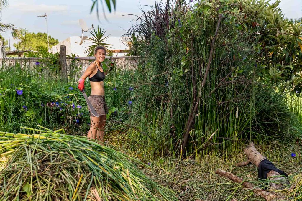 Wir betreten sein ca. 20m2 kleines, ganz rudimentäres Häuschen. Ein Raum mit einer kleinen Küchenecke, einer Treppe zu seiner Schlafecke und 2 weiteren Matratzen sind auf dem Boden für seine Gäste verteilt. Das Haus ist sehr einfach ausgestattet. Wir haben 3 Töpfe und 5 Teller, keinen Kühlschrank und kein heisses Wasser. Wer hier pingelig mit der Hygiene ist, kann gleich wieder gehen. Wir haben damit zum Glück überhaupt kein Problem. Es gibt kein Internet, kein Fernsehen und keine Couch, keine Geschirrspülmaschine und keine Waschmaschine, hier ist alles Handarbeit. Es fehlt uns aber trotzdem an nichts. Das einzige was ich vermisse ist die Ruhe (denn jeder Nachbar hat mindestens 2 Hunde, die bei jeder kleinen Gelegenheit ein Konzert vom allerfeinsten geben) und eine Hängematte im Garten, aber die muss noch etwas warten, denn zunächst wird gearbeitet.