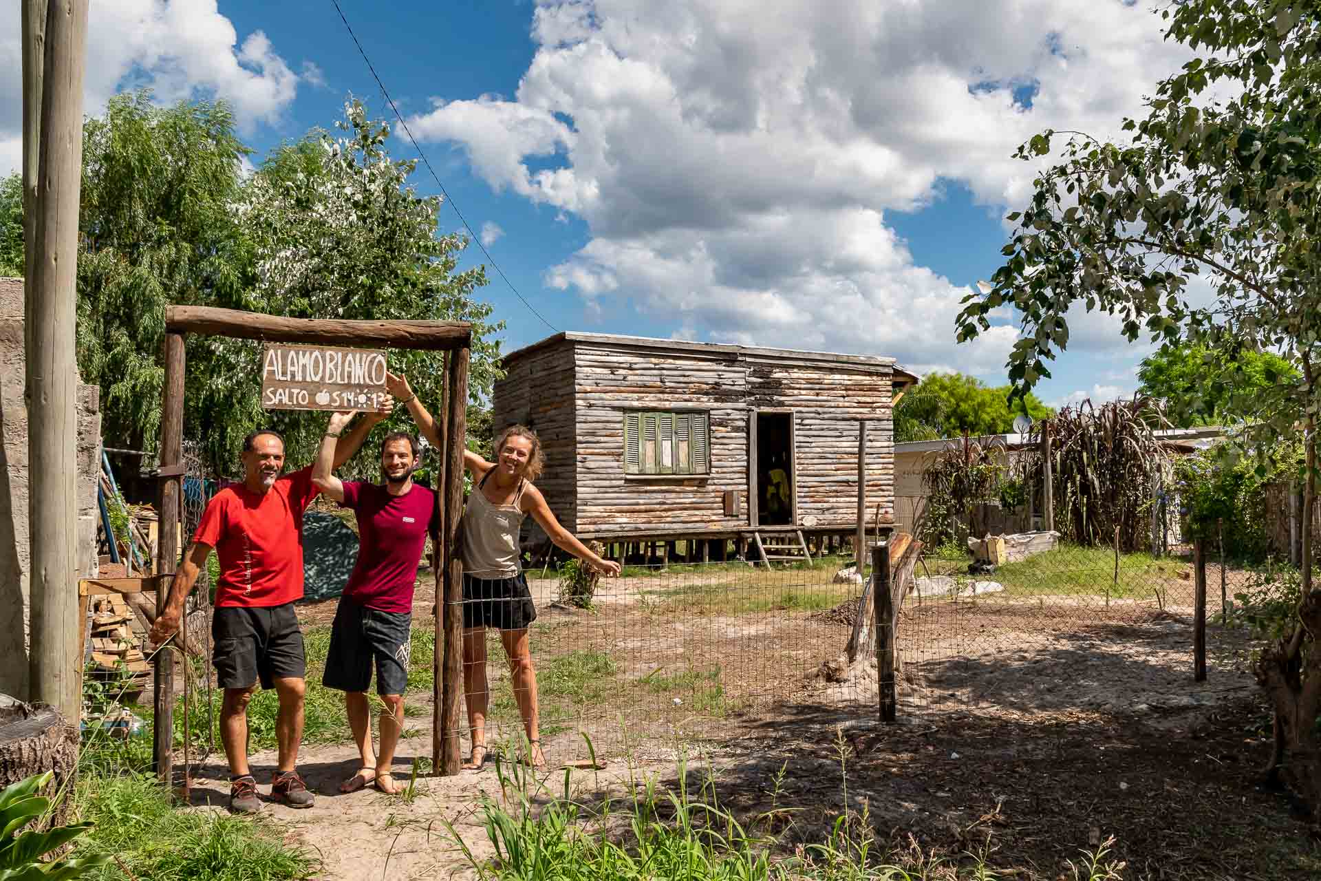 Ein paar Tage später sind wir 30 km östlich von Montevideo. Wir steigen aus dem Bus und laufen die ruhige und sandige Vorstadtstrasse entlang bis die Strasse im Nichts endet. Hier müsste es eigentlich sein. Lauthals bellen uns die Hunde an und die ersten Nachbarn gucken neugierig über ihre Zäune. Dann sehen wir es. Ein kleines Holzhüttchen, der Garten eine Baustelle und es fehlt der Zaun. Das muss es sein. Wir klopfen an der Tür und kurz danach erscheint Hugo.