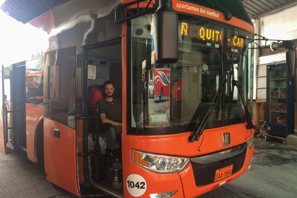 8 Stunden später kommen wir in der Andengroßstadt Quito auf 2850 m.ü.M an. Wir sind es gar nicht mehr gewohnt 8 Stunden getrennt zu sein und müssen erstmal die gewonnenen Erlebnisse teilen. Schon wie vor 7 Jahren lieben die Ecuadorianischen Busgesellschaften mitten am Nachmittag die übelsten Actionfilme in voller Lautstärke abzuspielen. Zwischendurch drängen sich die Verkäufer durch die Busse und preisen ihre tollen und supergünstigen Produkte an: Obst, Yukabrot, Empanadas, Getränke, Nüsse, Chips… man verhungert nie auf einer Fahrt in Ecuador. Roman hat es da vorne etwas ruhiger und bekommt von dem Gewusel hinten nicht viel mit.