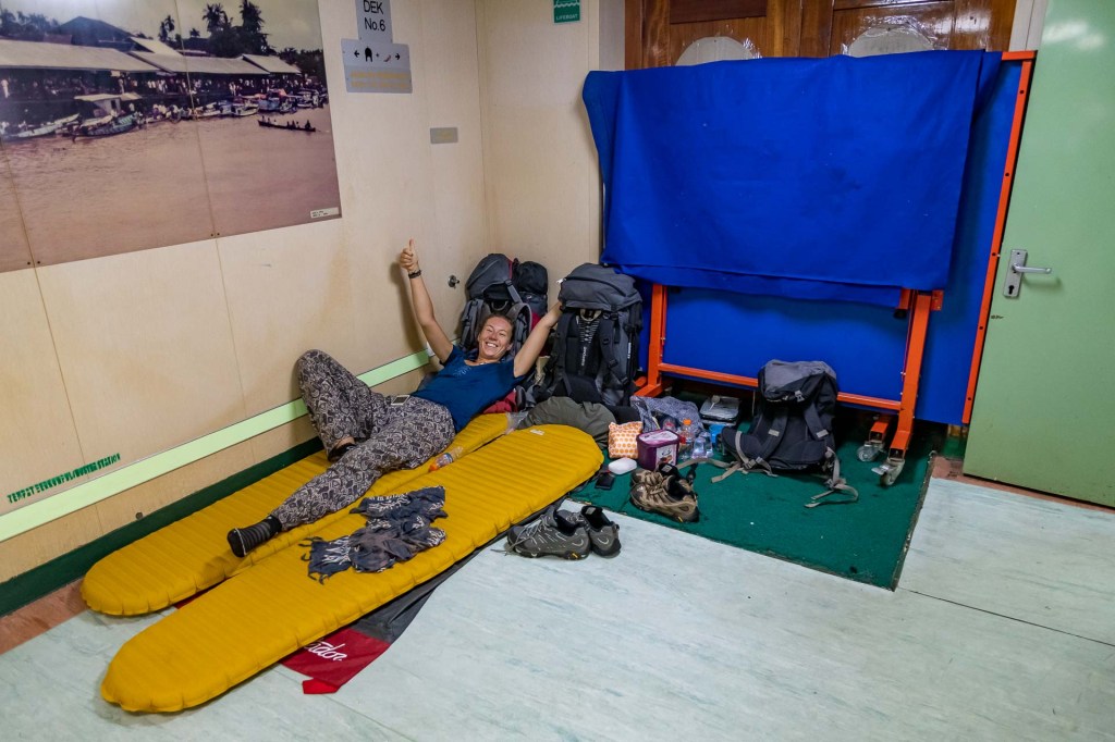 Zum Glück lernen wir direkt die fröhliche Sängerin Dyant kennen. Auf dem Weg zu ihrer Kabine kommt sie stets bei uns vorbei und teilt ihre zwei Stücke Melone mit uns. Trotz meiner fehlenden Indonesisch-Kenntnisse und ihrem fehlenden Englisch kann ich mit meinem Lachen ausdrücken wie dankbar ich ihr für diese Geste bin. Denn Morgens, Mittags und Abends gibt es trockenen Reis mit einem kleinen Stück Fisch und einer noch kleineren Portion verkochtem Gemüse. Sie lädt mich kurzerhand auf einen Kaffee in ihre Kabine ein und wir plaudern etwas, soweit die Sprache es zulässt.