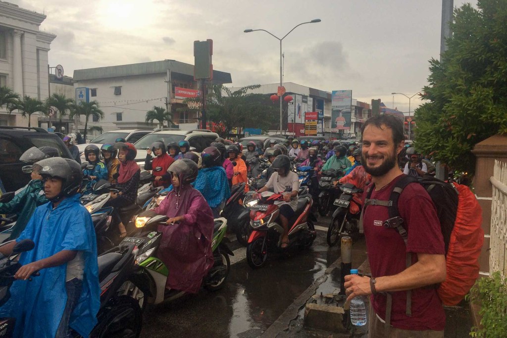 Wir schnallen unsere Rucksäcke auf und verlassen auf der wackeligen Treppe das Containerschiff. Willkommen in Asien und im feucht-tropischen Klima. Der Schweiß tropft schon nach 5 Minuten die Stirn runter. Nun heißt es auf schnellstem Wege zum Fährterminal gelangen, damit wir noch die Fähre nach Borneo erwischen, die nur alle 3 Wochen fährt. Ein Wettlauf gegen die Zeit beginnt, gefolgt von einem in Erinnerung bleibenden Fähr-Abenteuer.