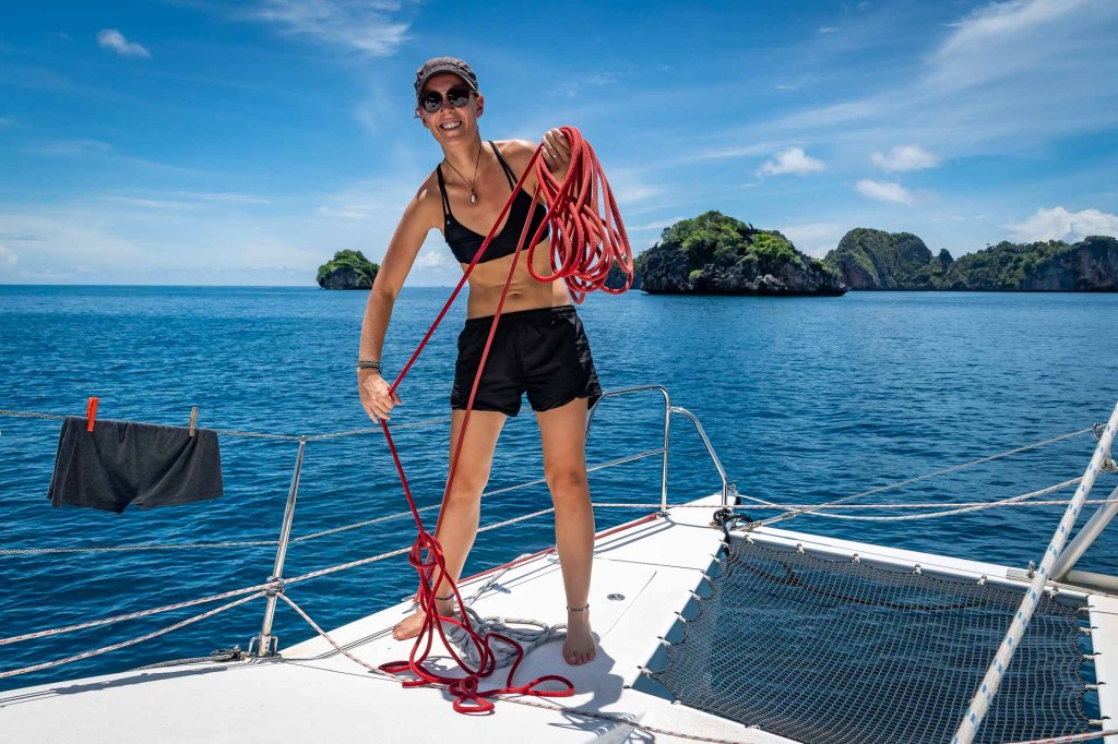 Wir fühlen uns direkt wohl an Bord. Der 2013 gebaute Katamaran ist super modern und schön eingerichtet, hat ein kleines “Wohnzimmer”, zwei Schlafzimmer, ein kleines Bad und eine Küche.
