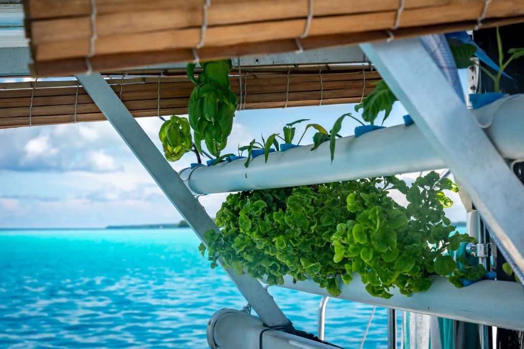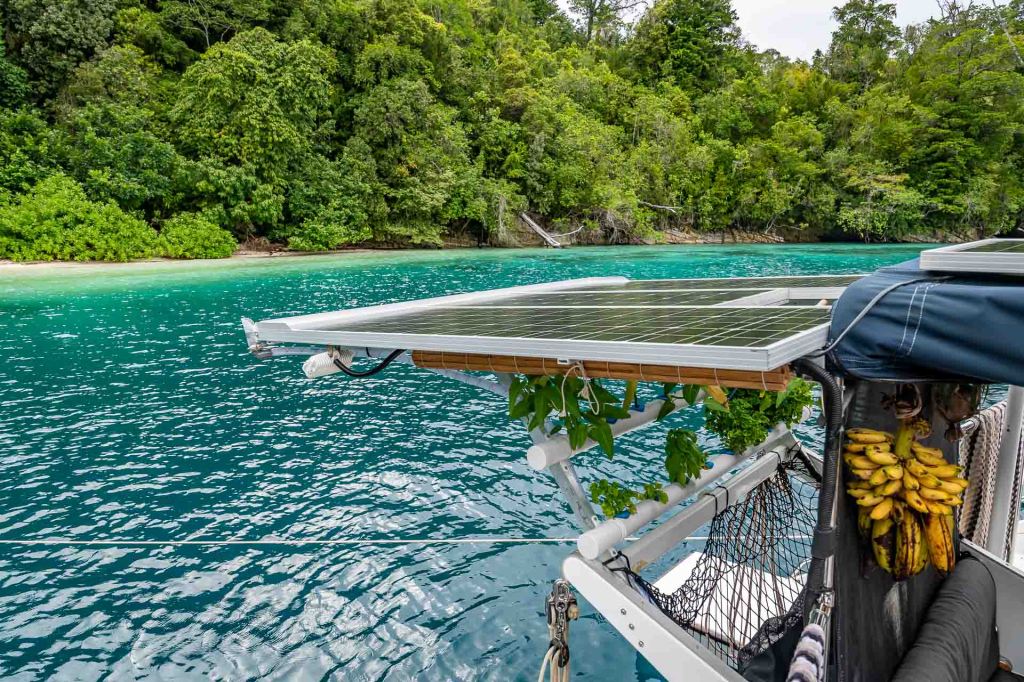 Als große Person braucht man allerdings seine 2-3 Wochen um sich nicht jeden Tag mindestens vier Mal den Kopf anzuschlagen. Auch die blauen Flecken an Alinas Beinen nehmen von Tag zu Tag zu. Wir erkundschaften das Boot und sind neugierig wie die beiden hier seit 15 Monaten leben. Ein bewusster Umgang mit den Ressourcen ist natürlich die Devise und Sparsamkeit, besonders mit dem Wasser, wird schnell zum Alltag. Mit Solarenergie kann die Entsalzungsanlage jeden Tag ca. 30 Liter Salzwasser in Trinkwasser filtern. Hinzu kommt das auf den Solarmodulen gesammelte Regenwasser. Die Solaranlage gibt uns bei Sonnenschein Strom für das Aufladen der Geräte und Handys und für das Licht. Einmal die Woche, oder häufiger bei schlechtem Wetter, läuft der Generator um alle Batterien vollständig zu laden. Eine kleine Hydro-Plantage sorgt stets für etwas frisches Gemüse und frischer Fisch wird mit viel Geduld und Können mit einer Harpune geschossen.